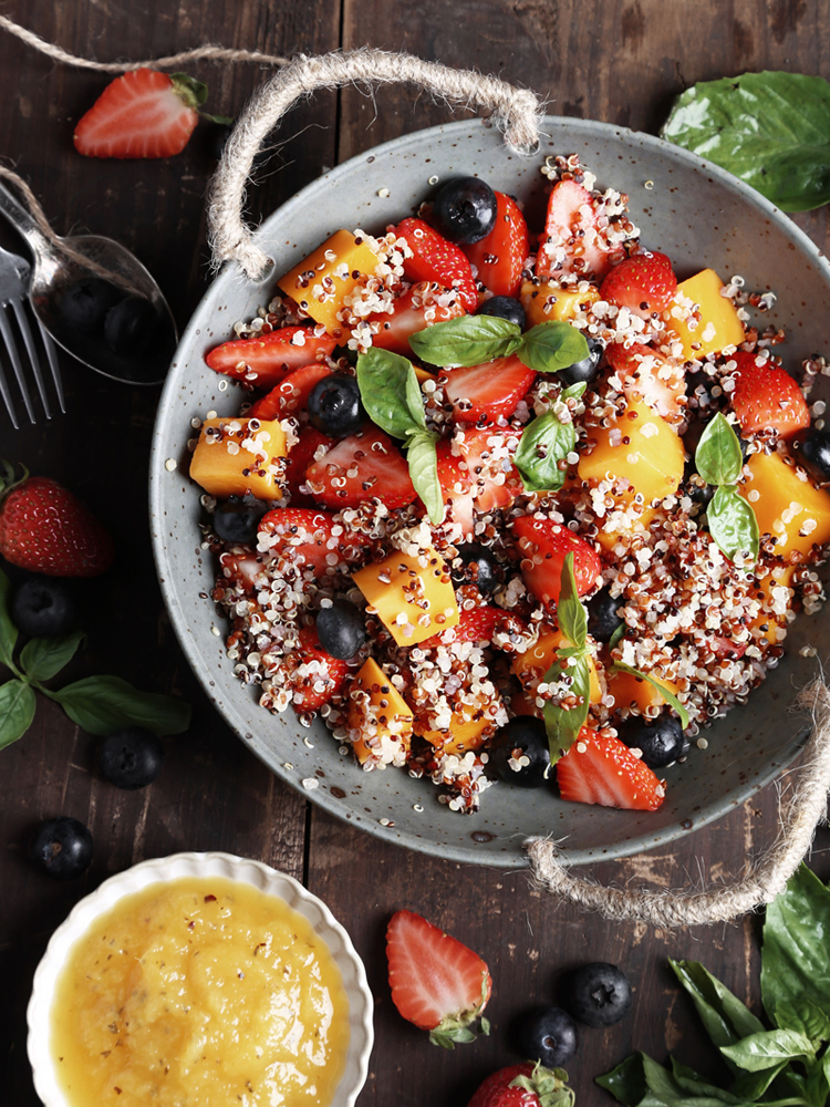 煮熟的藜麦自带清香,口感Q弹,不易粘黏,是非常百搭的沙拉食材。可以搭配肉蛋奶、水果、蔬菜等不同食材制作成藜麦主食沙拉,口感更独特,饱腹感也更强。