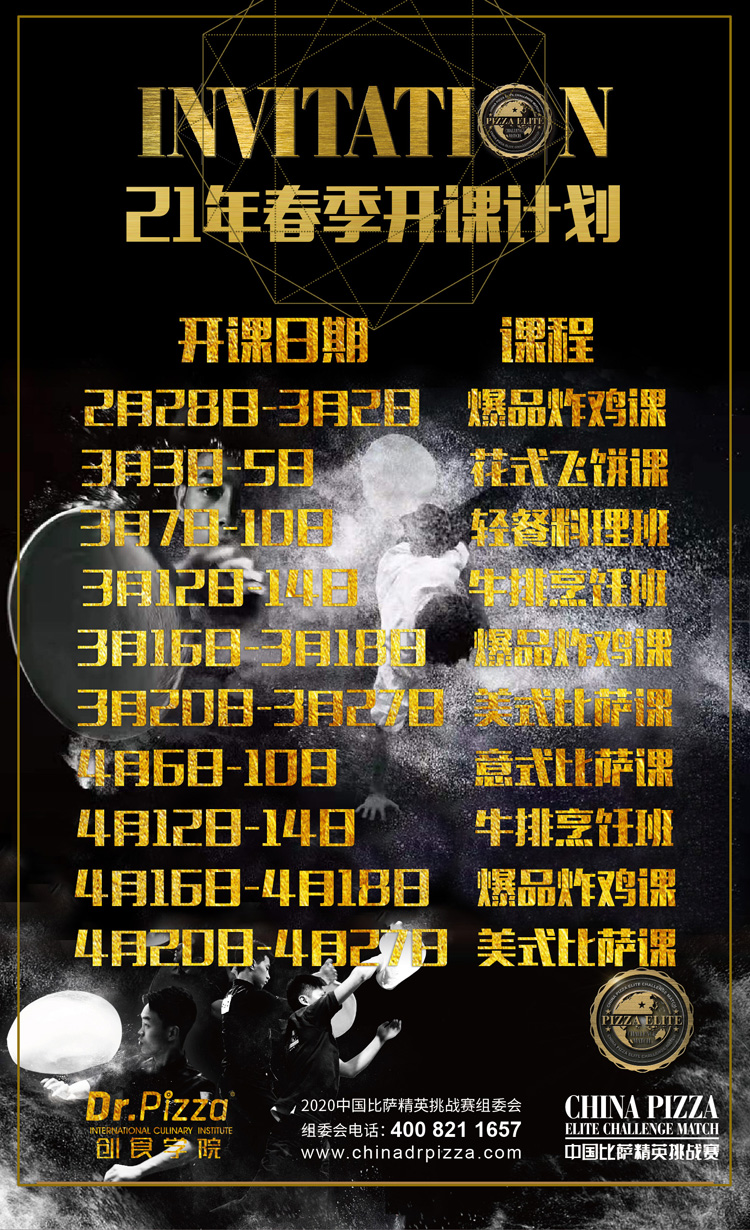 年后即将开授的课程有美式披萨班、意式比萨班、飞饼班、牛排班、轻餐班和炸鸡班等。春节前报名还可获得多重福利补贴,想在2021年加入餐饮创业大军的伙伴们,记得尽快联系咨询报名哦!