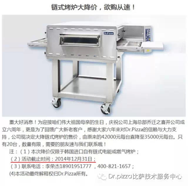 活动还有几天就要截止,需要的亲们,下手要趁早啊!另外,在公众微信号上直接回复数字“ 5 ”还可查看Dr.Pizza独家提供的链式烤炉拆洗重装详细教程。视频面对面,不怕不上手!